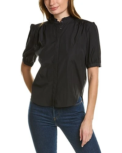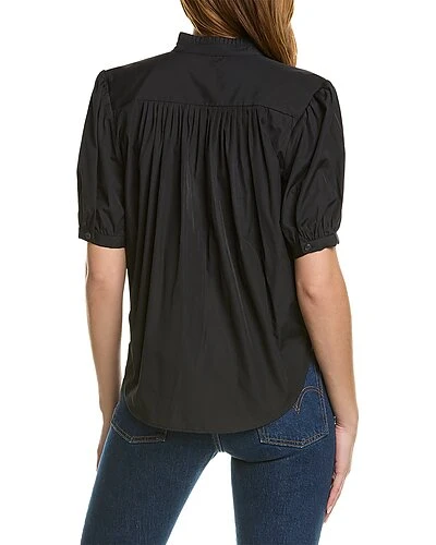 - Jordan Top in black with ruffled collar, shirring details, button cuffs and high-low hem