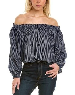 - Mimi Stripe Linen-Blend Top in blue stripe with off-the-shoulder neckline and elasticized trim