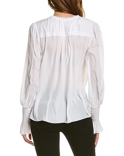 - Imanke Top in white with mock collar, ruffle trim, and smocked cuffs