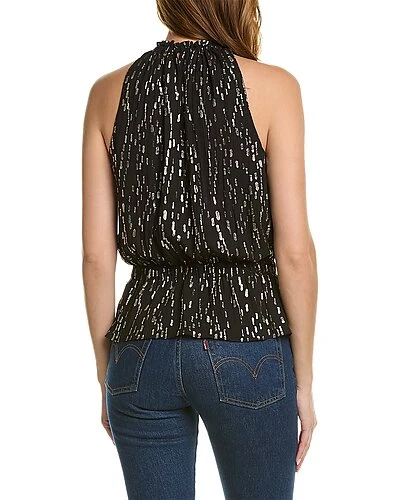 - Kaylene Top in black with elasticized ruffle collar and elasticized peplum waist
