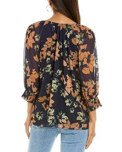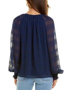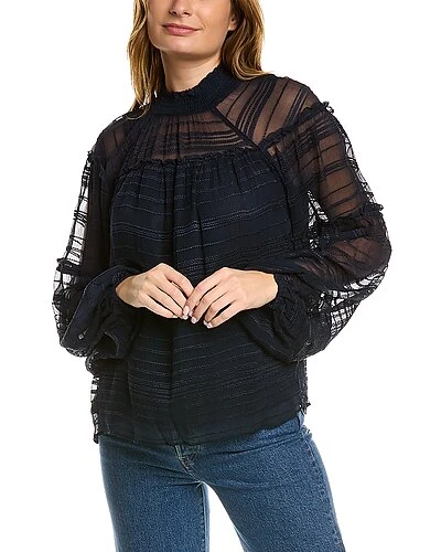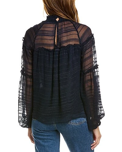 - Winslow Silk-Trim Top in navy with embroidered chiffon design, smocked mock neck, and bishop sleeves