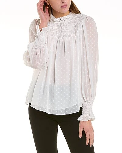 - Clip Dot Blouse in white with ruffle neck, shirring details, and flounce cuffs