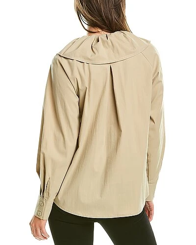 - Collared Blouse in khaki with ruffle neckline, velvety soft touch, inverted back pleat, shirttail hem, and pleated button cuffs