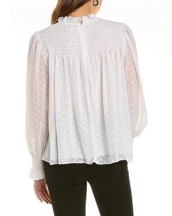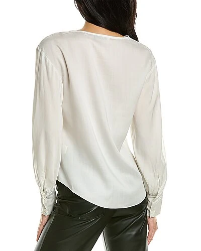 - Drawstring Blouse in snow with V-neck, ruched drawstring accent, blouson sleeves with button cuffs and high-low hem