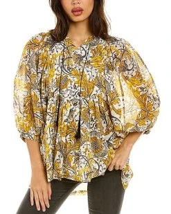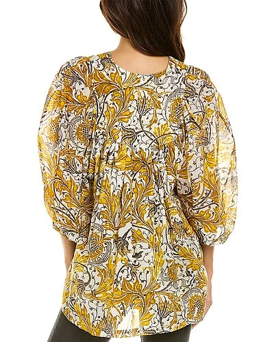 - Anastasia Top in ivory yellow zsa zsa walpaper with split neck, apron front, and 3/4-length dolman bubble sleeve