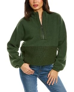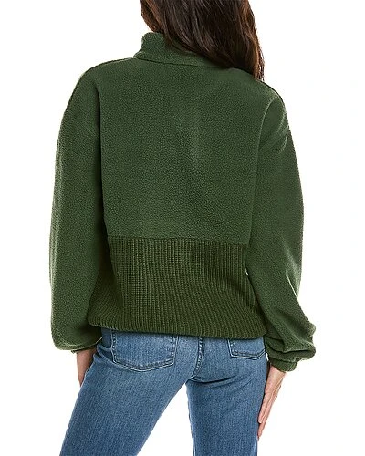 - Bolton Pullover in cypress with mixed-media design, stand-up collar, dropped-shoulder sleeves, elasticized cuffs, dual front pockets, and drawstring hem