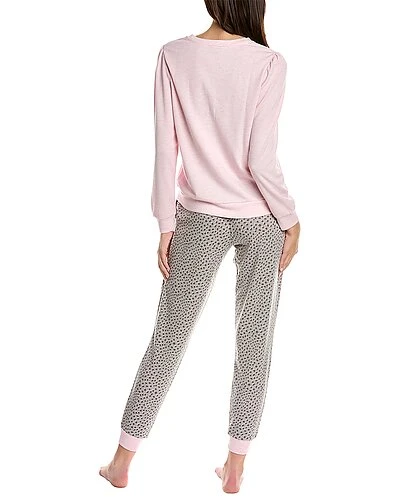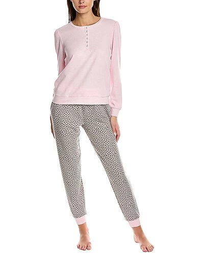 - Puff Sleeve Henley Jogger Set in pink with waffle-knit shirt, and printed slip-on drawstring jogger