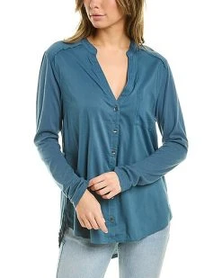 - Woven Mix Long Sleeve Shirt in Aegean with left chest pocket, raw edge seams, and shirttail hem