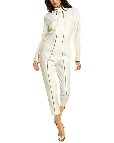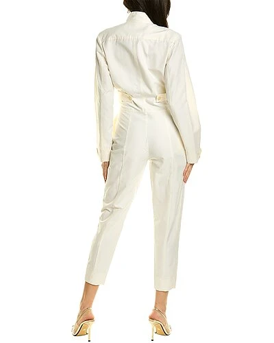 - Alma All In One Linen-Blend Jumpsuit in white with mock neck, dual chest pockets, button cuffs, dual side on-seam pockets, and button straps at waist