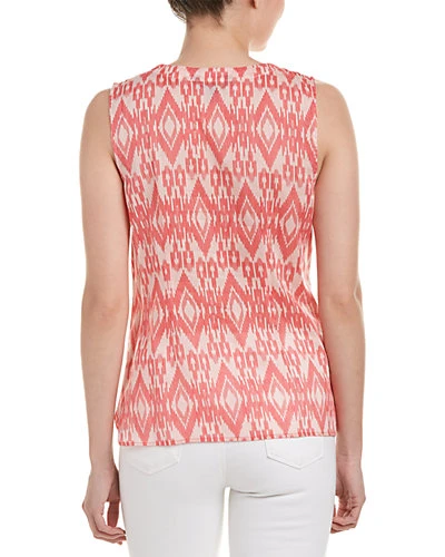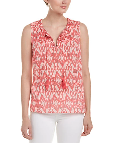 - Design details: sheer ikat printed design, diamond-pleated paneling, keyhole neck with self-tie closure