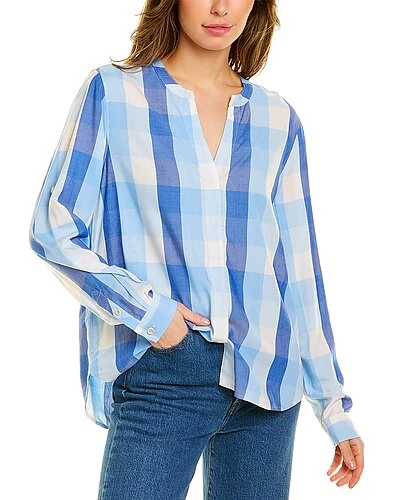 - Buffalo Check Shirt in light sky with band collar, roll-up tabs at sleeves, box pleat at back, and high-low hem