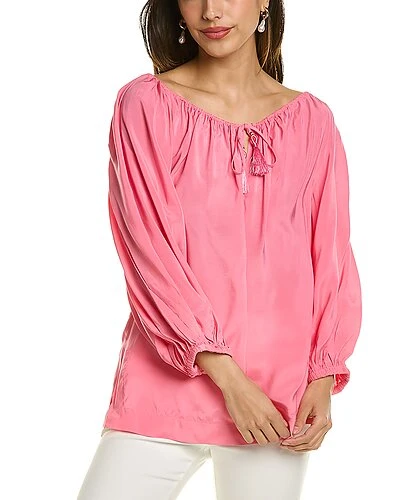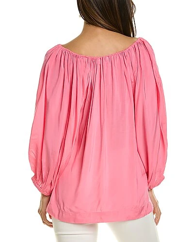 - Sandia Top in candy with wide V-neck with self-tie detail and elbow-length puff sleeves