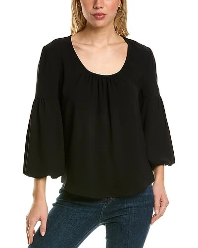 - Still Top in black with scoop neck and 3/4-length puff sleeves