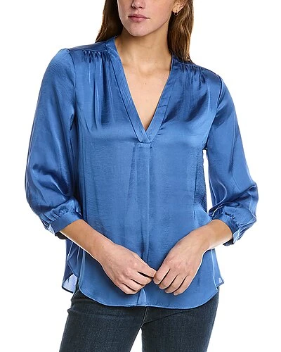 - 3/4-Sleeve Rumple Top in steel blue with V-neck, shirring details, 3/4-length sleeves with button cuffs and high-low hem