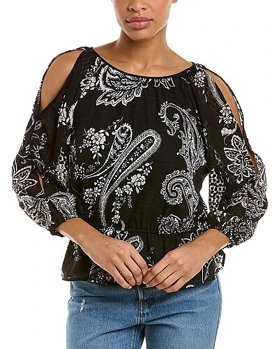 - Blooming Paisley Blouse in black and white combo with cold shoulders, button detail at sleeves, elasticized cuffs, and peplum hem