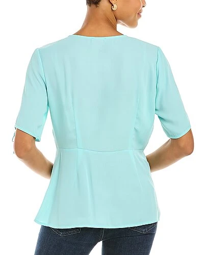 - Button Front V-Neck Blouse in crystal lake with V-neck, shirred bust and self-tie cuffs