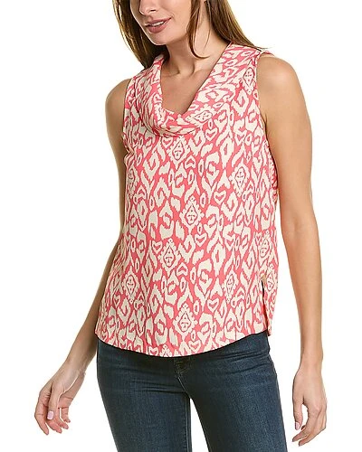 - Etched Geo Blouse in lush coral with cowl neck and side slits at seams