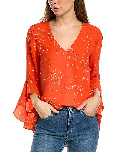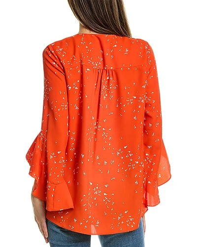 - Flutter Sleeve Blouse in blaze orange with V-neck, ruffled waterfall cuffs, and tulip hem