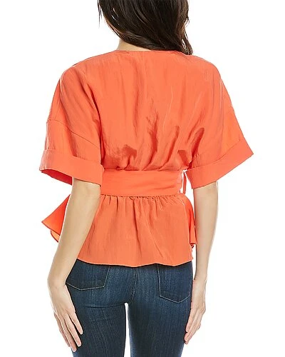 - Cuffed V-Neck Top in burnt orchid with split neckline, rolled cuffs, pleated detailing and self-tie belt at waist