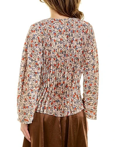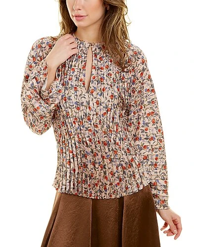 - Pomegranate Pleated V-Neck Blouse in chamois with keyhole button accent, high-low hem, and pleated accents