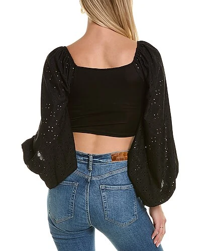 - Ruched Eyelet Top in black with balloon sleeves and drawstring cinched front