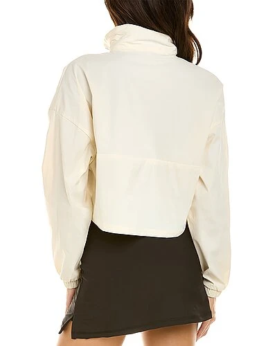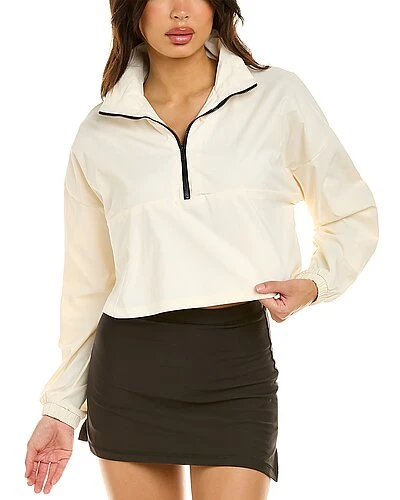 - Solid Cropped 1/4-Zip Pullover in off white with stand collar, dropped-shoulder sleeves with elasticized cuffs and cropped hem with side slits