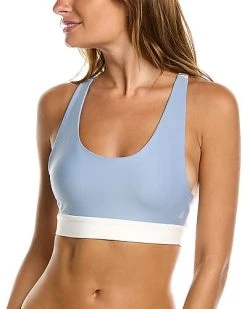 - Solid Scoop Bra Top in dusty blue/off white with colorblocked design, adjustable back straps and removable soft cups
